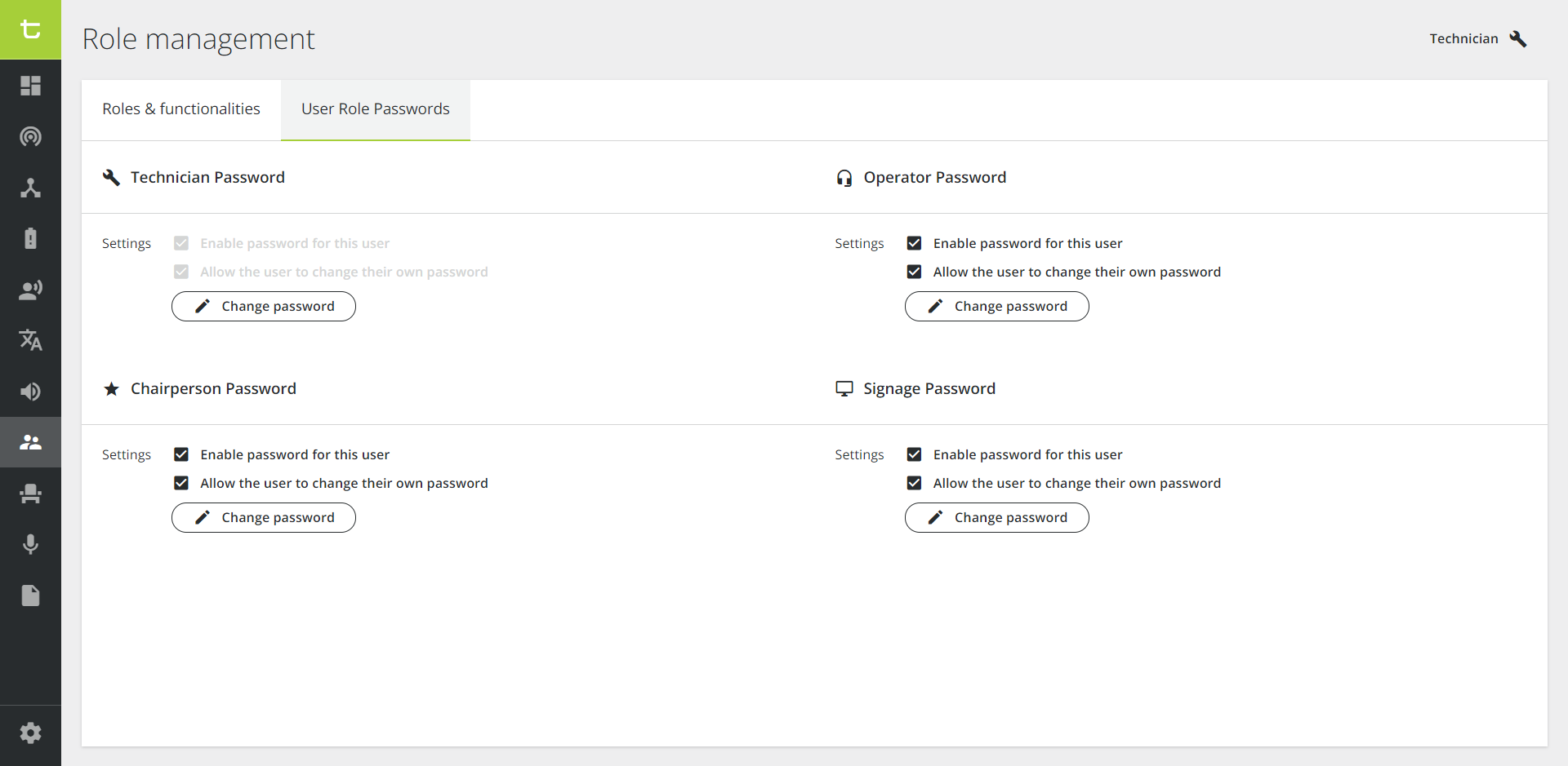 Click on the button Change password to enable, disable, reset or change existing passwords for the Technician, Operator, Chairperson and Signage. To change a password, you first need to enter the old password before entering a new one.