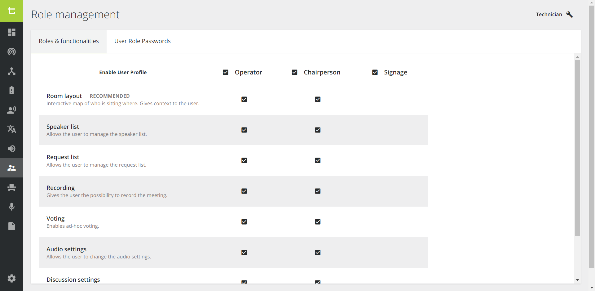 On the Roles & functionalities tab, you can set which information and actions are available for the Chairperson, Operator and Signage user. The options can be divided into three groups: