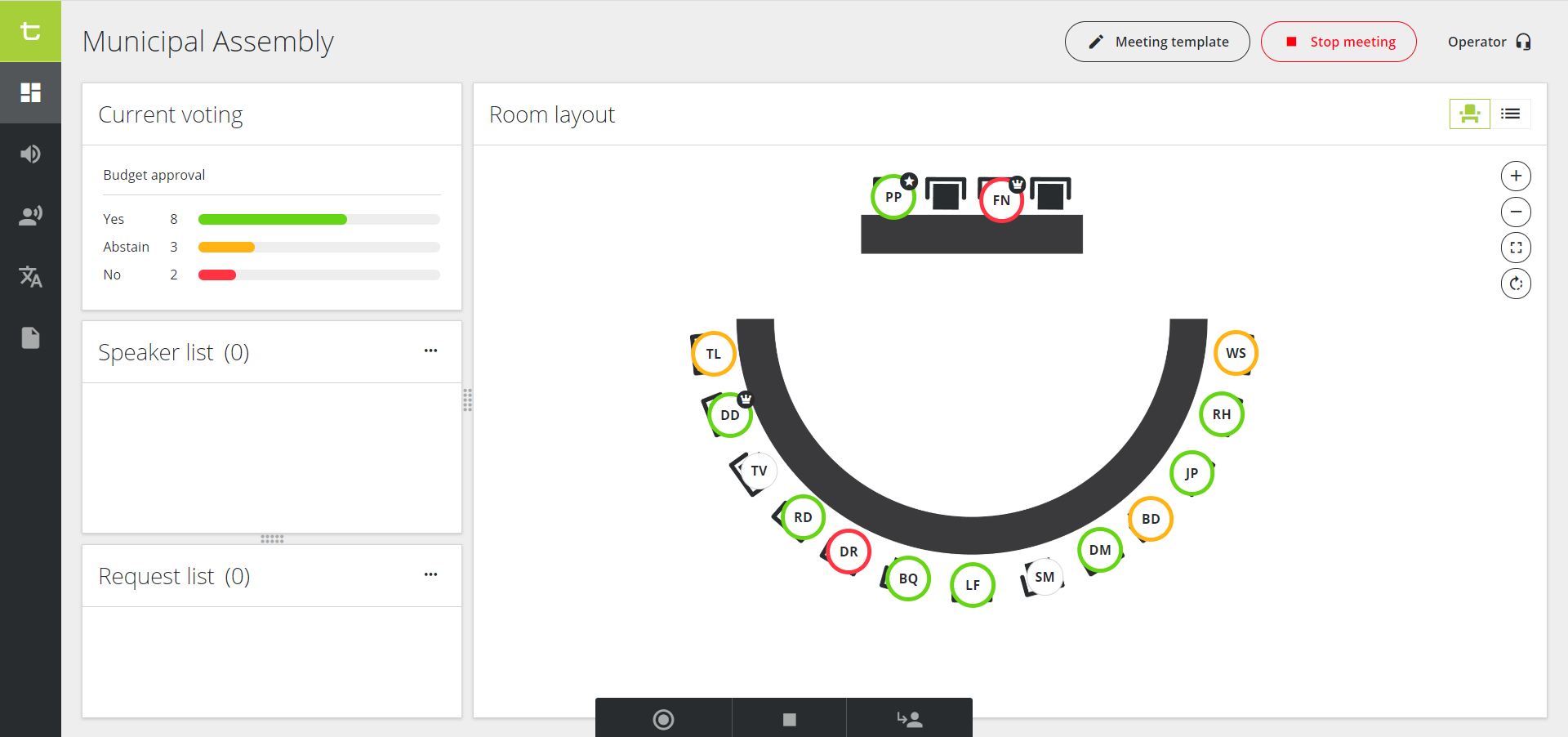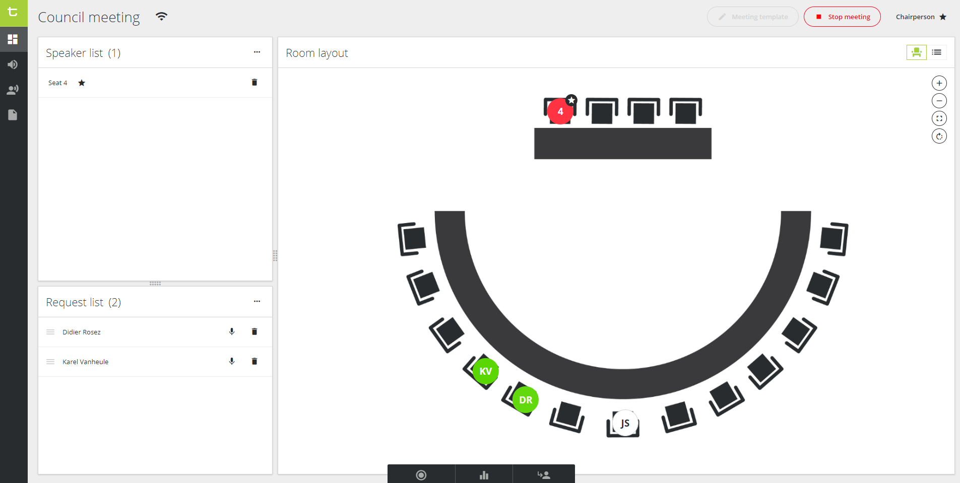Figure 1-2: Dashboard of the Chairperson and Operator with Room layout, and speaker and request list