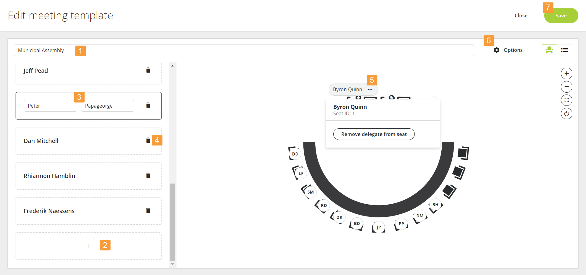 - Assign participants to a seat by selecting one of the seats from the dropdown list (5).