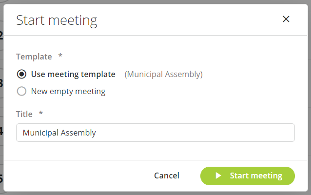 When you click Start meeting, a dialog box appears where you can select which meeting template to use and the meeting title.